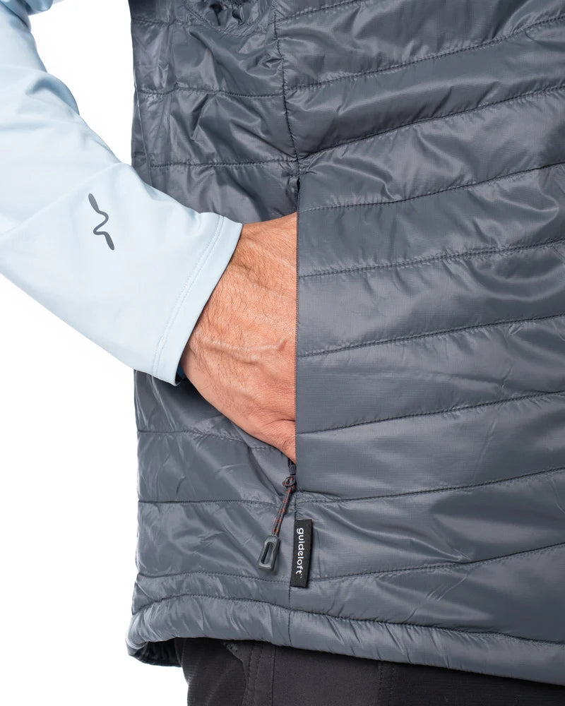 Västen har ett vindavvisande yttertyg och är isolerad med Guideloft 60 g återvunnen isolering för hög värme i förhållande till låg vikt. Den kan packas ner i sin egen innerficka för smidig transport. Funktionella detaljer som hög krage, elastiska ärmhål, Hypalon dockningsyta och håvögla baktill gör den väl anpassad för fiske.